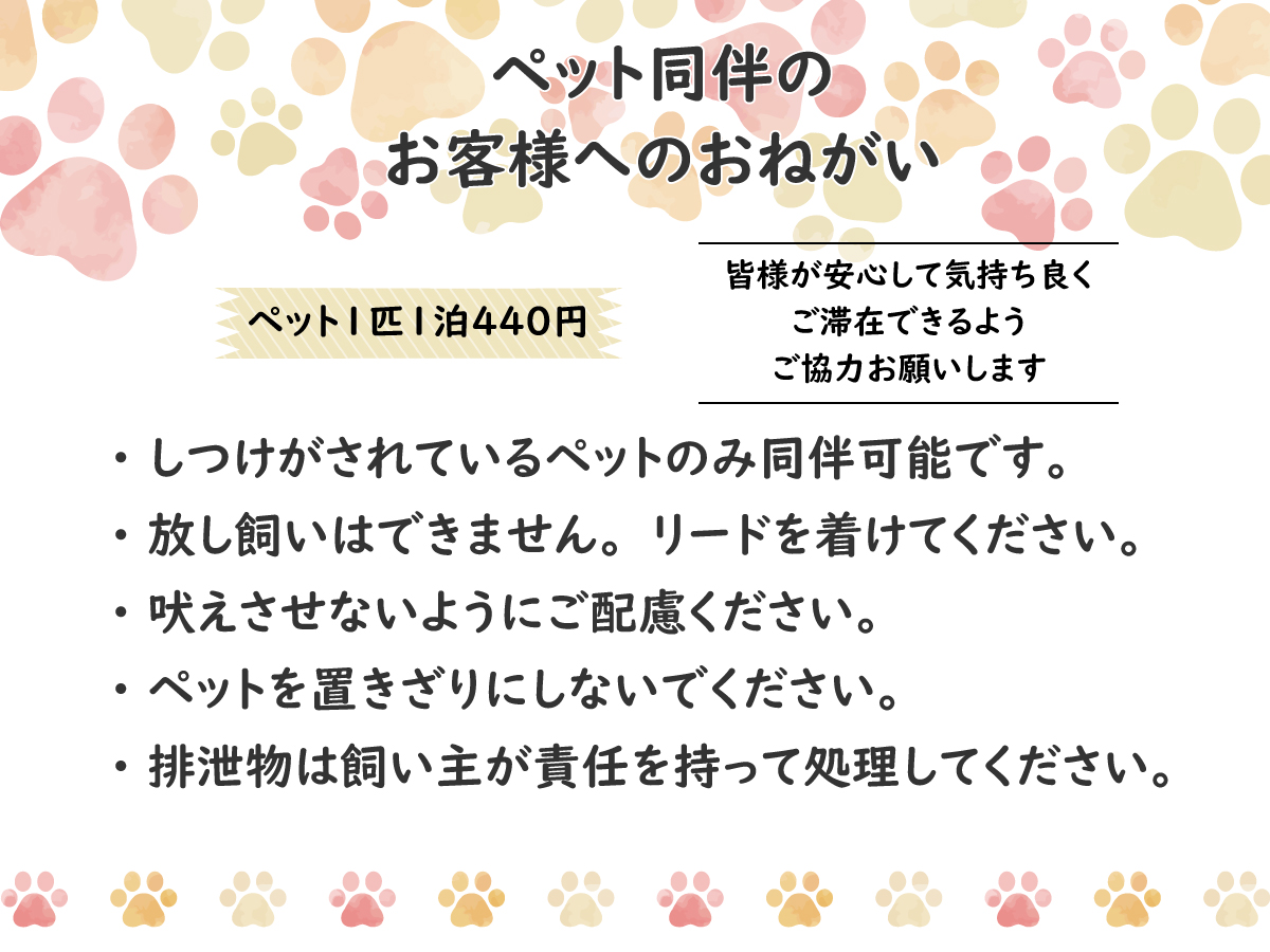 ・「ペット同伴のお客様へお願い」や、一般的なマナーをお守りください。